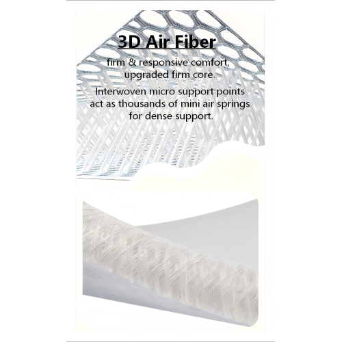 - 3D 에어 파이버 + 포켓 스프링 : 3D 에어 파이버(40 파이버/cm²)는 작은 지지대 역할을 하여 척추를 필요한 위치에 바로 들어 올리고 공기가 공기 흐름을 원활하게 하여 통기성이 뛰어난 최고급 매트리스 입니다. 포켓 스프링을 추가하면 탁월한 모션 격리 매트리스 성능을 얻을 수 있습니다. 파트너가 넘어져도 아무런 느낌이 없으며 더 이상 자정에 깨어날 필요가 없습니다.