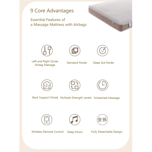 SereneHaven 스마트 마사지 매트리스를 만나기 전까지는 단순히 "몸을 지탱하는" 것 이상의 역할을 하는 매트리스를 찾는 것이 어려운 일처럼 느껴집니다. 이것은 단순한 스마트 매트리스 나 고급 매트리스가 아닙니다. 매일 밤의 잠을 진정한 회복 경험으로 바꾸도록 설계된 최첨단 기술과 최고의 편안함을 결합한 게임 체인저입니다. 우리는 침구에서 더 많은 것을 원하는 현대 가정(및 글로벌 B2B 파트너)을 위해 이 제품을 만들었습니다. 개인화된 휴식, 실제로 효과가 있는 척추 지지대, 위생이나 내구성에 대한 타협 없는 생각을 생각해보세요. 기본 폼 매트리스 옵션과 달리 이 지능형 전기 매트리스는 귀하의 신체, 선호도, 심지어 수면 파트너의 요구 사항까지 조정하므로 SereneHaven 침대 매트리스 라인업에서 단연 돋보이는 제품입니다.